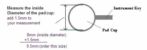 2. If you have the key off the instrument and the pad removed. You can measure the inside diameter of the pad cup. This is the part of the cup where the cardboard backing sits. Once you have this measurement, add 1.0mm. The result will be the pad size you need to order. For example. If the inside diameter of the pad cup is 8.0mm. Add 1.0mm to this measurement (9.0mm total) and order that size (9.0mm).