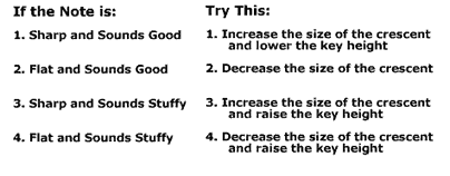 All of the tuning work discussed in this article is 100% reversible. If the player is unsatisfied with the adjustments, the instrument can be restored to its original state. In our shop at MusicMedic.com we use other tuning methods than those outlined in this article, and some of these tuning methods are not easily reversible. Instrument modifications require the consent of the player. As you work, use your ear to make decisions about tone and intonation. This article is a general guide for you to get an idea about the effect of crescents. If you have trouble hearing slight timbre changes, or do not trust your own judgment, ask a friend for assistance. If you are up to the challenge remember that a tuner is essential for adjusting the intonation of your instrument.
